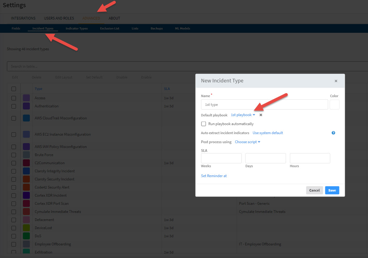 Next step is to attach your playbook to your ingestion of events. In settings /Advanced / Incident Types – create New Incident Type linked to your playbook.
